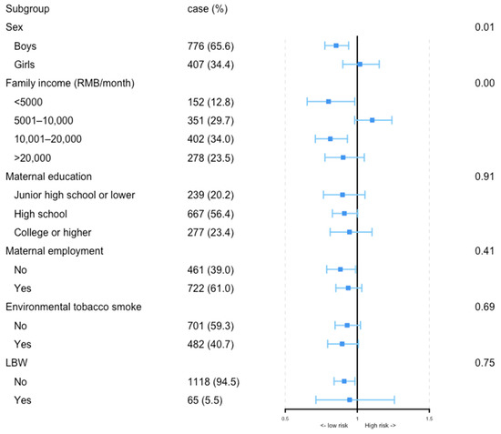 In the sex-stratified analysis, the negative associations of greenness with hyperactivity behaviors were only statistically significant in boys (OR = 0.85 [95% CI: 0.77,0.94]), but not in girls (OR = 1.02 [95% CI: 0.90,1.15]) (Figure 1), and the between-sex difference was statistically significant (p for interaction = 0.01). For monthly family income, the pattern was less clear. No significant effect modification was observed for other factors.