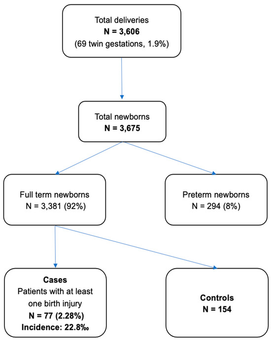 During the year 2021, a total of 3606 deliveries were registered with a final number of 3675 newborns, of which 3381 (93.8%) were full-term infants. A total of 231 newborns were included in the study, with 77 cases and 154 controls. The final number of birth injuries was 96 injuries in 77 patients, which represents an incidence of 22.8‰ of term newborns (Figure 1).