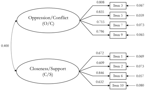 The reliability of the scale, estimated using Cronbach’s α, was 0.80, while McDonald’s ω was 0.77. In detail, Cronbach’s α and McDonald’s ω for Factor 1 (Oppression-Conflict) were 0.87 and 0.87, and for Factor 2 (Closeness-Support), they were 0.77 and 0.78, respectively.