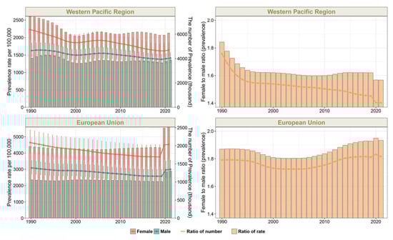 The sex difference trends in the prevalence of depressive disorders among adolescents and young adults aged 10–24 years in the Western Pacific and European Union regions, 1990–2021. The bar graph, referring to the left y-axis, displays the prevalence rate (per 100,000). The line graph, referring to the right y-axis, displays the female-to-male ratio equivalent to the prevalence rate of females/the prevalence rate of males.