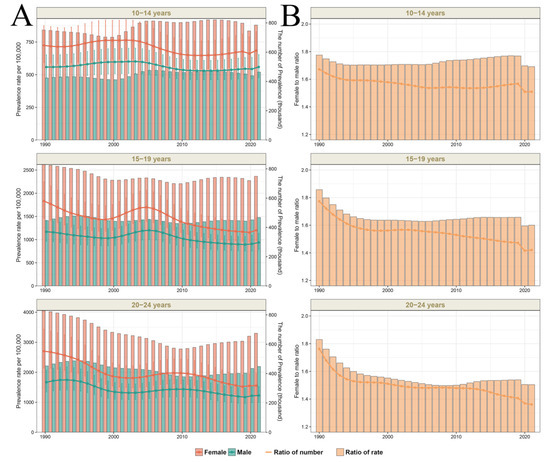The trends in sex difference in the prevalence number and rate of depressive disorders in the Western Pacific region, by age, 1990–2021. Panel (A) shows the number and rate of prevalence due to depressive disorders. The bar graph, referring to the left y-axis, displays the prevalence rate (per 100,000). The line graph, referring to the right-axis, displays the prevalence number. Panel (B) shows the female-to-male ratio of DALYs due to depressive disorders, which equals the number or rate of prevalence of females/the number or rate of prevalence of males.