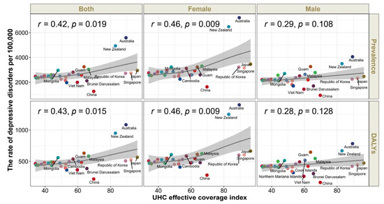We first reported the rate (per 100,000 population) and number with corresponding 95% UIs of prevalence and DALYs and showed the percentage change (95% UIs) of prevalence and DALYs rate by sex ( male, and female) and age (10–14, 15–19, and 20–24 years) between 1990 and 2021, and then we compared sex and age differences in the prevalence and DALYs of depressive disorders in adolescents and young adults aged 10–24 years in the Western Pacific region. In addition, we analyzed the associations of the prevalence and DALYs rate of depressive disorders with the UHC effective coverage levels using the Spearman correlation.