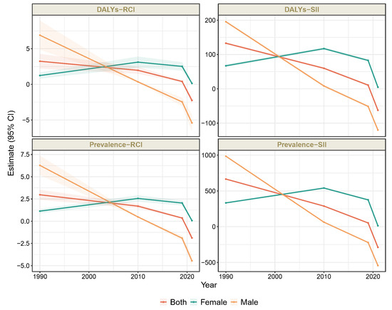 Figure 4 and Table S4 show the trend in the UHC effective coverage-related health inequality for the burden of depressive disorders in people aged 10–24 years in the Western Pacific region, and there were significant inequalities in the burden of depressive disorders across countries with various UHC effective coverage levels. The gap in prevalence rate between countries with the highest and lowest UHC effective coverage level was narrowed considerably from 1990 to 2021, which indicated that the burden of depressive disorders is shifting towards countries with lower UHC. Specifically, the SII changed from 665.48 (95% CI: 659.47, 671.50) in 1990 to −287.89 (95% CI: −293.72, −282.06) in 2021, and the RCI changed from 2.97 (95% CI: 2.41, 3.53) in 1990 to −1.88 (95% CI: −2.12, −1.63) in 2021. The similar gap in prevalence rates between countries with the highest and lowest UHC effective coverage level was also narrowed considerably from 1990 to 2021 for both females and males. The SII narrowed from 332.75 (95% CI: 322.92, 342.58) in 1990 to 13.31 (95% CI: 3.93, 22.69) in 2021, and the RCI narrowed from 1.14 (95% CI: 0.90, 1.37) in 1990 to 0.07 (95% CI: 0.02, 0.12) in 2021 in female and the SII decreased from 984.81 (95% CI: 977.68, 991.94) in 1990 to −543.21 (95% CI: −550.40, −536.02) in 2021, and the RCI decreased form −6.28 (95% CI: 5.18, 7.36) in 1990 to −4.45 (95% CI: −5.05, −3.86) in 2021 in male.