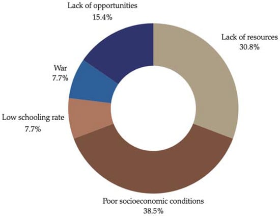 The interviewees also agreed that a lack of resources (30.8%) and poor socioeconomic conditions (38.5%) pertaining to their country of origin are the main factors that affect conditions when migrant minors arrive to their destination country. However, other characteristics such as a lack of opportunities (15.4%), a low schooling rate (7.7%), and war (7.7%) were also mentioned in the interviews [Figure 1].