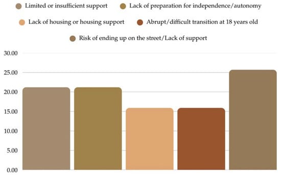 Likewise, the existing literature agrees with the interviewees in the present study in that the need to integrate in a new country in a forced and rapid manner leads to both psychological and emotional issues that often converge in situations of exclusion by the host society. This creates a vicious cycle in which already existing affective deficiencies are further exacerbated, driving the emergence of new or heightened disruptive behaviors [14]. In line with this, it is clear that, once they reach adulthood, these young people must integrate into society from an already highly disadvantaged situation, without any support. This leads to emotional and psychological problems that can result in disruptive behaviors and emotional deficiencies [9].