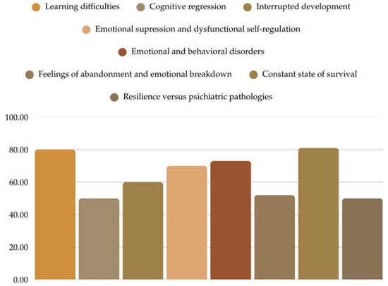 By means of a conclusion regarding the results produced by the present study, the following graph summarizes the main neuroeducational and emotional factors affected by migratory trauma in unaccompanied foreign minors (UFMs). This graph illustrates the prevalence of various cognitive, emotional, and behavioral difficulties reported in the interviews, highlighting the profound impact that the migratory process has on the development and wellbeing of these minors. The data emphasize the urgent need to implement specific support strategies to address the complex needs of UFMs and promote their resilience and adaptation to new realities [Figure 7].