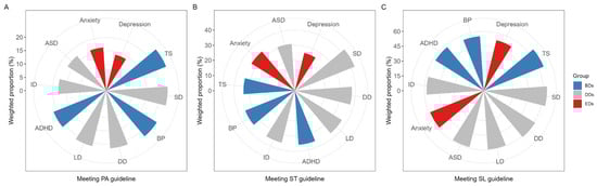 Among children with various MBDDs, those with depression had the lowest weighted proportion of meeting PA (13.91%, 95%CI: 12.02–16.03%), ST (25.74%, 95%CI: 23.46–28.17%), and sleep (52.70%, 95%CI: 50.17–55.22%) guidelines (Figure 1). As shown in Supplementary Tables S1–S10, the majority of children with MBDDs had a lower weighted proportion of meeting the PA, ST, and sleep guidelines compared to those without MBDDs, including anxiety, depression, ASD, and ID (all p values < 0.05). However, there were no significant differences in the weighted proportion of meeting the PA guideline among children with ADHD or BP in BDs, children with LD or ID in DDs, and children without corresponding disorders (all p values > 0.05).