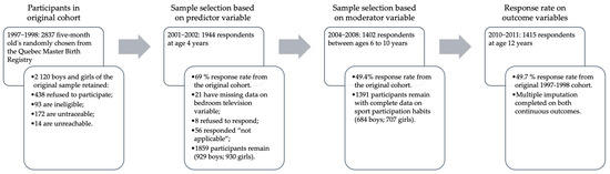 This IRB-approved longitudinal study uses data from the Quebec Longitudinal Study of Child Development (CEREP-2022-3024; QLSCD; https://www.iamillbe.stat.gouv.qc.ca/ accessed on 18 September 2025) coordinated by the Institut de la Statistique du Québec. The initial sample consisted of 2837 infants randomly selected from a birth registry and born between 1997 and 1998. The sample included children from single births to mothers residing in Quebec, Canada. Children were deemed ineligible for this study if they were born highly premature and/or were residing in Nord-du-Québec, Nunavik, or Terres-Cries-de-la-Baie-James at the time of data collection. After informed consent, participant data were collected from ages 5 months to 12 years annually during early childhood and biennially during school years through interviews and self-reported questionnaires administered to parents, children, and teachers. A subsample of 684 boys and 707 girls with complete data on bedroom television at age 4 years and sport participation habits between ages 6 and 10 years was retained. Participant response rates are shown in Figure 1.