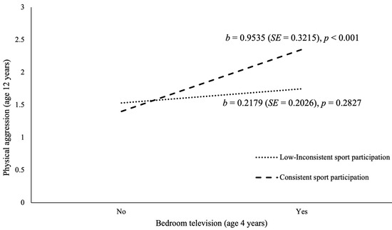 For boys, sport participation trajectories between ages 6 and 10 years significantly moderated the relationship between bedroom television at age 4 years and physical aggression outcome at age 12 years. This interaction amplified the association between having a bedroom television and later physical aggression (standardized β = 0.096, p ≤ 0.01). Specifically, boys with a television in their bedroom as toddlers saw a significantly greater increase in physical aggression at age 12 years when they had consistently participated in sport (standardized β = 0.2537, p < 0.001). Figure 2 illustrates the decomposition of this interaction. No interaction results were found in girls.