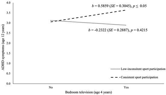Table 4 documents the adjusted OLS unstandardized regression coefficients reflecting the direct relationship between bedroom television at age 4 years and later ADHD symptoms at age 12 years and the moderation effects by sport participation trajectories between ages 6 and 10 years for boys and girls. Early bedroom television at age 4 years did not predict an increase in later ADHD symptoms among boys and girls. For girls, consistent sport participation between ages 6 and 10 years predicted a decrease in ADHD symptoms (standardized β = −0.105, p < 0.01). For boys, sport participation between ages 6 and 10 years significantly amplified the relationship between bedroom television at age 4 years and ADHD symptoms at age 12 years (standardized β = 0.076, p < 0.05). Specifically, boys in the consistent sport participation trajectory had a greater increase in ADHD-related symptoms at age 12 years when they had a television in their bedroom at age 4 years (standardized β = 0.1114, p < 0.05). Figure 3 illustrates the decomposition of this interaction. No significant interaction was found for girls.