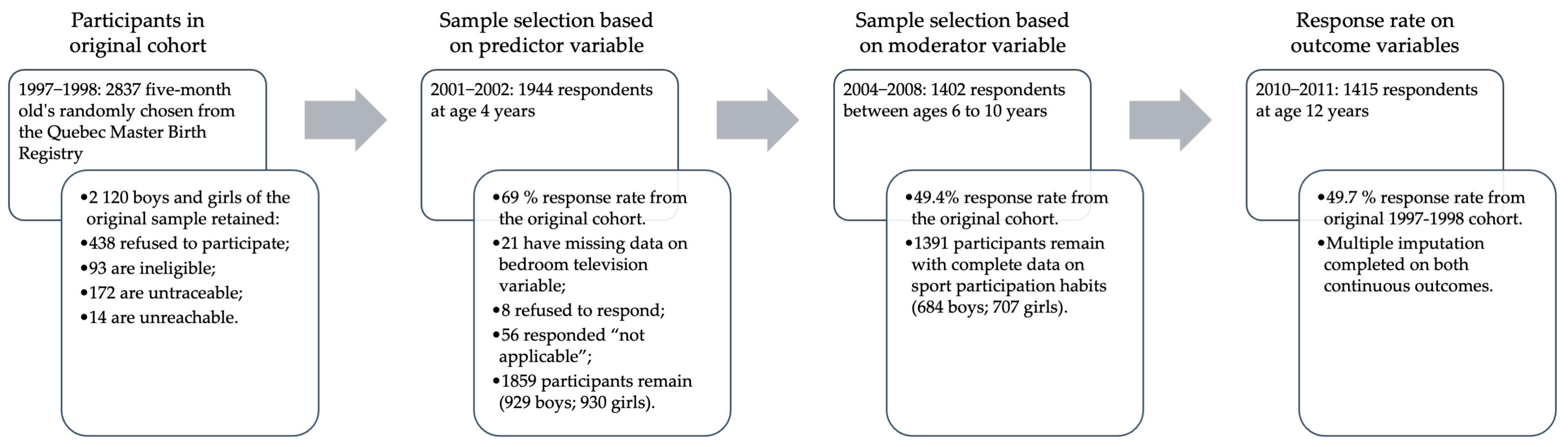 - Pagani, L.S.; Harandian, K.; Gauthier, B.; Kosak, L.-A.; Necsa, B.; Tremblay, M.S. Middle Childhood Sport Participation Predicts Timely Long-Term Chances of Academic Success in Boys and Girls by Late Adolescence. Med. Sci. Sports Exerc. 2024, 56, 2184–2194. [Google Scholar] [CrossRef] [PubMed]