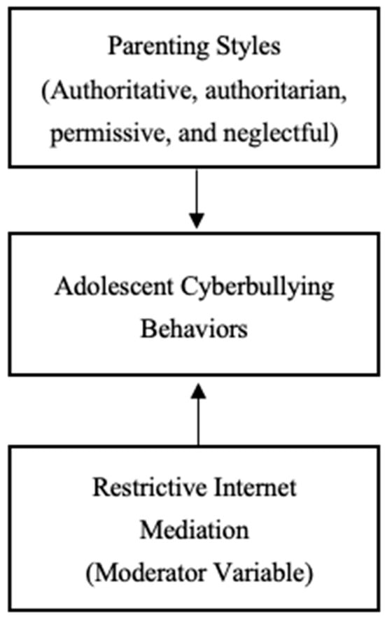 To structure this study’s assumptions, the following conceptual framework (Figure 1) illustrates the proposed relationship between perceived parenting styles and adolescents’ cyberbullying behaviors, with restrictive internet intervention modeled as a moderator. The framework is grounded in Baumrind’s typology [1,2] and reflects prior findings suggesting that parenting control strategies—especially RPII—can either buffer or exacerbate behavioral outcomes in digital contexts [48,54]. In this model, RPII is hypothesized to alter the strength or direction of the relationship between parenting styles and the likelihood of cyberbullying perpetration or victimization.