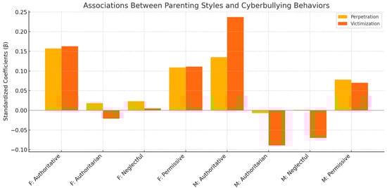 Figure 2 shows the standardized regression coefficients (β) of parenting styles in predicting adolescents’ cyberbullying perpetration and victimization. The chart visualizes the effects of fathers’ and mothers’ authoritative, authoritarian, neglectful, and permissive parenting styles on adolescents’ cyber-perpetration and cyber-victimization. Statistically significant associations (p < 0.05) are highlighted, revealing the strongest predictive effects for authoritative and permissive styles, particularly from fathers, and a notable negative association for mothers’ authoritarian style.