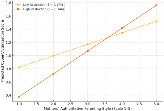 Fisher’s Z analysis was conducted to identify differences between two regression coefficients derived from the high/low RPII. The calculation showed that there was a statistically significant difference between the two regression coefficients for high/low RPII (p < 0.05) by the mother with regard to cyber-victimization. Table 3 shows that, at one standard deviation above the RPII mean, the linear relationship between mothers’ high authoritative parenting style and cyber-victimization is statistically significant and positive (β = 0.346, p < 0.001), whereas the relationship between low authoritative parenting style and cyber-victimization is weaker (β = 0.174, p < 0.001). This indicates that cyber-victimization increased as mothers’ authoritative parenting style increased more when mothers applied high RPII than when their authoritative parenting style was less restrictive, and this is shown graphically in Figure 3, where the gradient of the slope was higher for ‘high restrictions’ than for ‘low restrictions’. The plot shows that higher levels of restrictive internet intervention significantly strengthen the positive association between mothers’ authoritative parenting style and adolescents’ cyber-victimization, as evidenced by the steeper slope in the “High Restriction” condition.