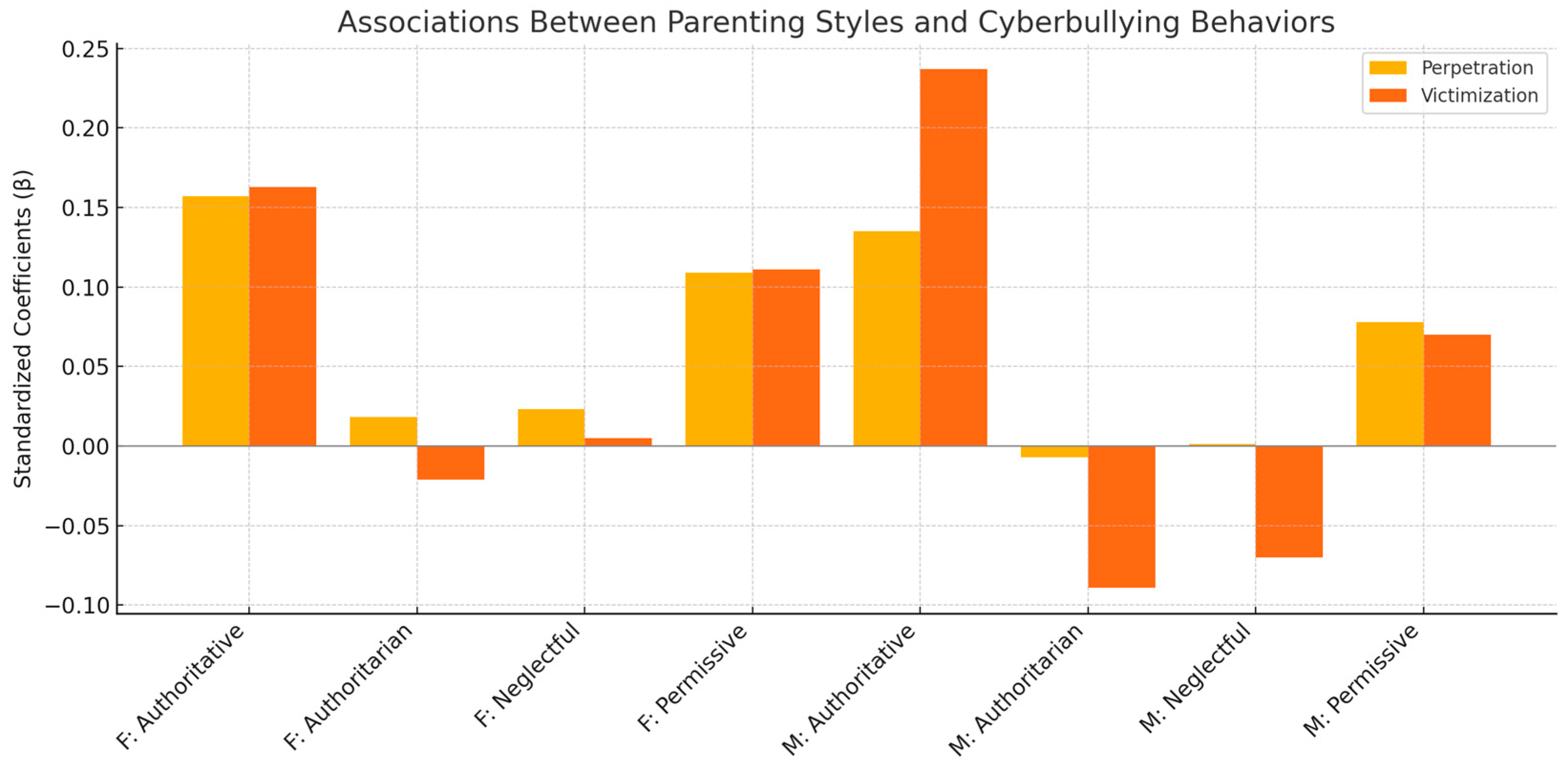 Figure 2 shows the standardized regression coefficients (β) of parenting styles in predicting adolescents’ cyberbullying perpetration and victimization. The chart visualizes the effects of fathers’ and mothers’ authoritative, authoritarian, neglectful, and permissive parenting styles on adolescents’ cyber-perpetration and cyber-victimization. Statistically significant associations (
