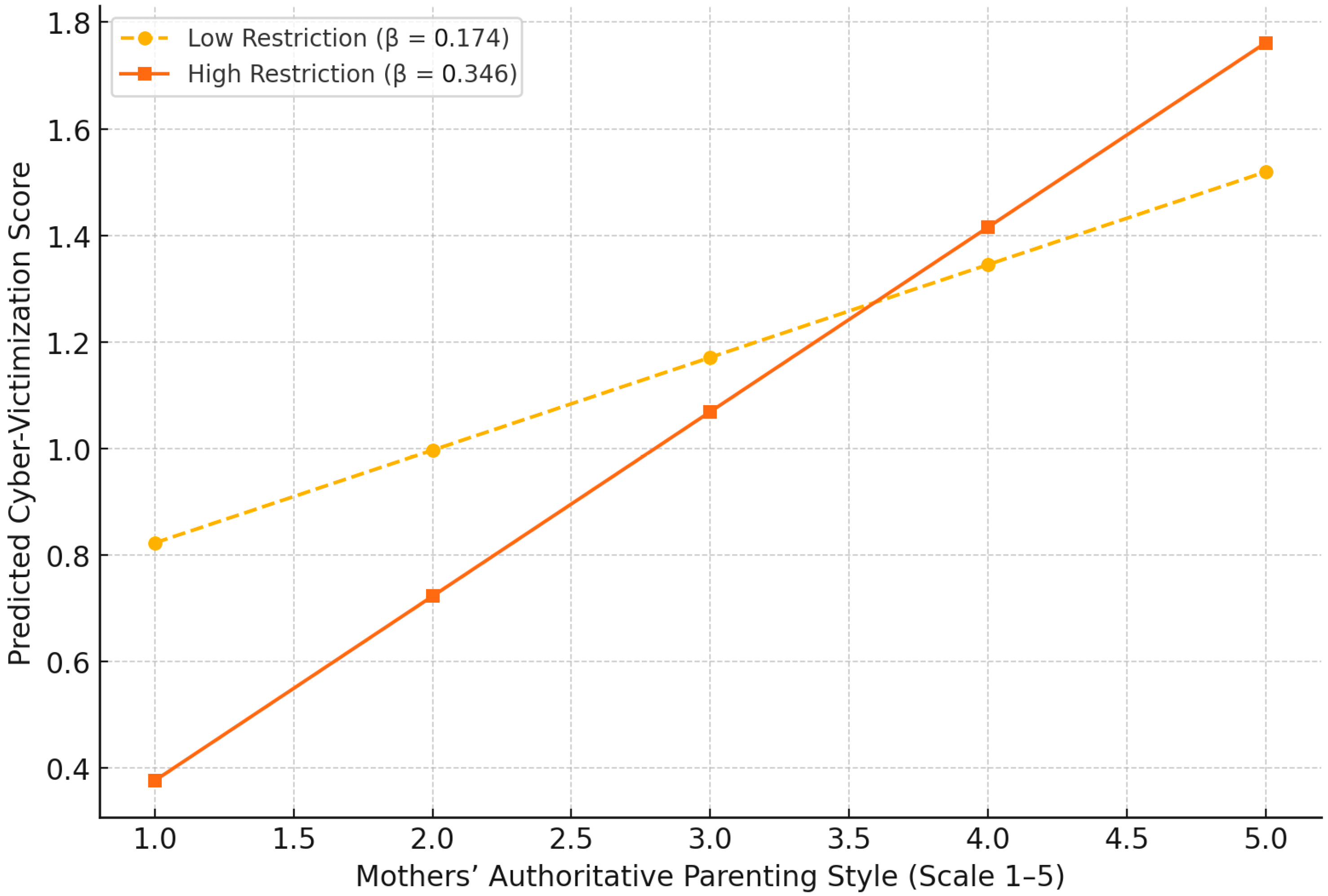 Figure 3, where the gradient of the slope was higher for ‘high restrictions’ than for ‘low restrictions’. The plot shows that higher levels of restrictive internet intervention significantly strengthen the positive association between mothers’ authoritative parenting style and adolescents’ cyber-victimization, as evidenced by the steeper slope in the “High Restriction” condition.