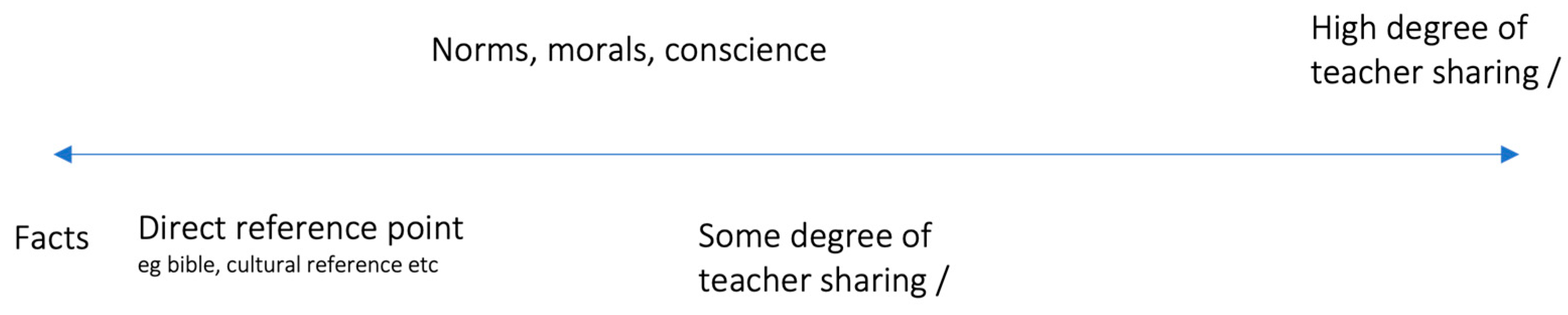 Low sharers were participants who stated they did not engage in storytelling or sharing personal anecdotes and stuck to facts and figures. This was the smallest group with only three participants, who expressed they did not share personal views at all. There was an acknowledgement by these teachers of how difficult this practice was and they admitted to avoiding content in lessons due to inability to remain neutral and not share personal views.