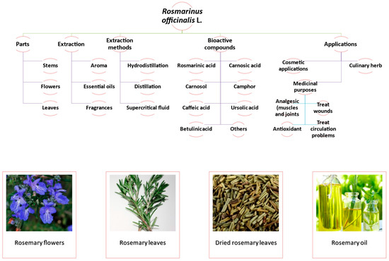Properties of R. officinalis with respect to plant parts, extraction methods, bioactive compounds, and applications. Frames show examples of flowers [16] and leaves [17] of rosemary, as well as dried rosemary leaves [18] and rosemary oil [19]. Photos in frames were obtained from https://pixabay.com, (accessed on 10 March 2023) with no attribution required, and free use under a Pixabay license.