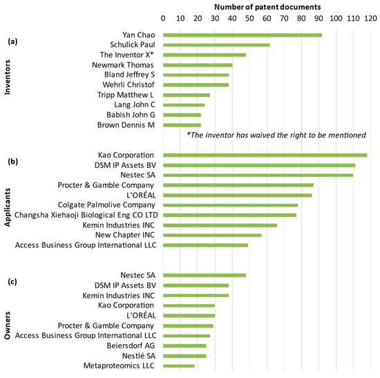 Top 10 ranking of inventors (a), applicants (b), and owners (c) of R. officinalis-related patents as a function of the patent documents between 2002 and 2022.