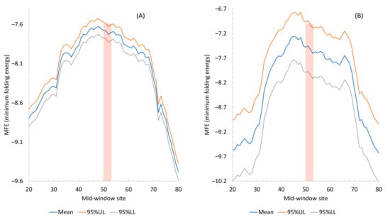 Secondary structure stability, measured by MFE (minimum free energy), decreases near translation initiation signal. The 95% upper and lower limits (95% UL and 95% LL) are also plotted. The mid-window site (horizontal axis) indicates the middle of the sliding window of 40 nt. The start codon, indicated by the vertical bar, occupies the sites 51, 52, and 53. (A) From all 4707 protein-coding genes in M. abscessus. (B) From all 226 protein-coding genes in the three phages (63 in BPs, 71 in Muddy, and 92 in ZoeJ), with 95% UL and LL wider than in (A) because of a smaller number of genes than that in M. abscessus.