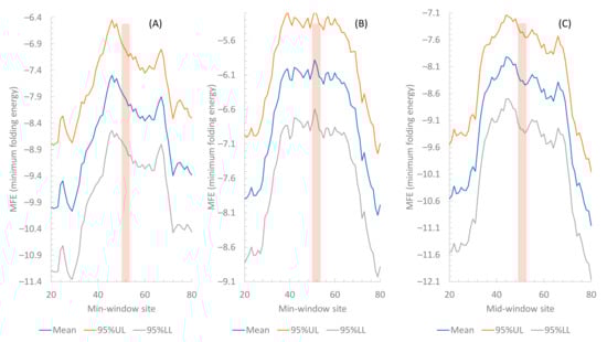 Comparison of MFE (mean and 95% upper and lower limits) along a sliding window of 40 nt among three phage species. The vertical bar indicates the position of the start codon. (A) Phage BPs (n = 63). (B) Phage Muddy (n = 71). (C) Phage ZoeJ (n = 92).