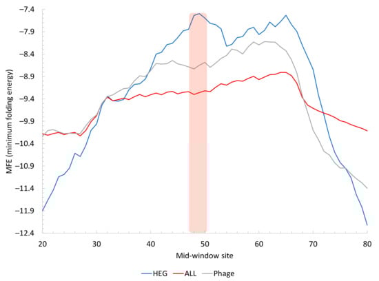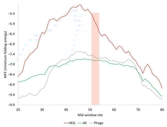 If the reduction in secondary structure stability near the stop codon is important for translation termination, then one should expect the highly expressed genes in M. abscessus to exhibit even a stronger pattern than the average of all M. abscessus genes shown in Figure 7A. This is indeed the case (Figure 8). The change in MFE near the stop codon is the most dramatic in HEGs in M. abscessus (Figure 8). The phage genes have weaker secondary structure than an average M. abscessus gene. However, the weak secondary structure in HEGs (Figure 8) suggests that one should aim to further reduce the secondary structure stability of phage mRNAs.