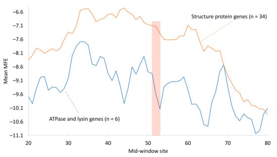 Contrast of average MFE between genes encoding structure proteins (representing mass-produced phage proteins, including capsid proteins, head-to-tail adaptors, head-to-tail stoppers, major tail subunits, minor tail proteins, tail assembly chaperones, tail terminators, minor tail subunits, and scaffolding proteins, n = 34 from all three phages) and those encoding ATPase and lysins (representing non-mass-produced phage proteins, n = 6 from all three phages). MFE is calculated along a sliding window of 40 nt. The vertical bar indicates the position of the start codon.