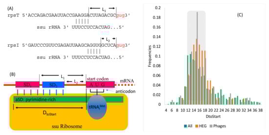 SD/aSD base-pairing is illustrated with two ribosomal protein genes rpsT and rpsI in M. abscessus (Figure 5A) to highlight a common misconception of an optimal distance between SD and the start codon. The distance (L1) between the SD sequence for rpsT (AAGGA, Figure 5A) and the start codon is greater than that (L2) for rpsI (SD = AGGUG, Figure 5A). As both ribosomal proteins are highly expressed, one may wonder if the differences between L1 and L2 matter in translation initiation. A model of SD/aSD base-pairing [,] to juxtapose the start codon and the initiation tRNA anticodon (Figure 5B) shows SD1 and SD2 by base-pairing with different aSD sequences at the 3’ end of the small subunit (ssu) rRNA; both serve to align the start codon against the anticodon of the tRNA. In spite of the differences between L1 and L2, the distance DtoStart remains the same, being 15 for both rpsT and rpsI. If DtoStart changes, then the aligned start codon and the initiation tRNA anticodon would be shifted out of alignment (Figure 5B).