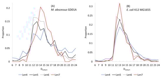 The relationships between DtoStart and SD/aSD base-pairing length in (A) M abscessus and (B) E. coli. Len4 to Len7 represent four to seven consecutive base-pairings between SD and aSD. The distribution becomes increasingly peaky from four consecutive base-pairs to seven consecutive base-pairs.