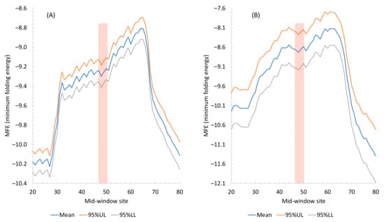 Secondary structure stability, measured by MFE (minimum free energy), decreases near the stop signal. The 95% upper and lower limits (95% UL and 95% LL) are also plotted. The midwindow site (horizontal axis) indicates the middle of the sliding window of 40 nt. The stop codon, indicated by the vertical bar, occupies the sites 48, 49, and 50. (A) From all 4912 protein-coding genes in M. abscessus. (B) From all 226 protein-coding genes in the three phages (63 in BPs, 71 in Muddy, and 92 in ZoeJ), with 95% UL and LL wider than in (A) due to a smaller number of genes than that in M. abscessus.