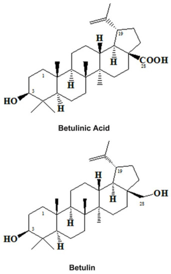 - Pisha, E.; Chai, H.; Lee, I.S.; Chagwedera, T.E.; Farnsworth, N.R.; Cordell, G.A.; Beecher, C.W.W.; Fong, H.H.S.; Kinghorn, A.D.; Brown, D.M.; et al. Discovery of betulinic acid as a selective inhibitor of human melanoma that functions by induction of apoptosis. Nat. Med. 1995, 1, 1046–1051. [Google Scholar] [CrossRef]
