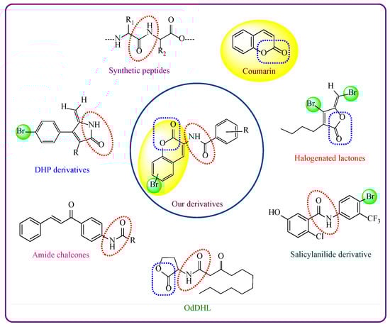 Over recent years, several natural and synthetic molecules have been reported in the literature that can cause disruption of the QS signaling cascade by mimicking signaling molecules, thereby inactivating the QS system by blocking the receptor and preventing gene expression and biofilm formation [,]. Brominated furanone firstly isolated from Delisea pulchra (marine algae) in 1993 showed potent QS inhibitory activity []. Since then, several halogenated lactones and non-lactone mimics have been reported to disrupt QS signaling and biofilm formation [,]. In 2019, Almohaywi et al. reported dihydropyrrolones as bacterial quorum sensing inhibitors (QSIs) []. The most active compound of this series exhibited 63.1% QS inhibition at 31.25 µM and 60% biofilm inhibition at 250 µM. Liu et al. recently reported the biofilm inhibitory activity of some aryl-substituted pyrrolidone derivatives with IC50 values in the range of 0.219 to 0.281 mM against Pseudomonas aeruginosa PAO1 []. Some other non-AHL-based QSIs, such as N-aryl glyoxamide-based small molecules, reduced biofilm formation in P. aeruginosa MH602 up to 71.2% at 250 µM [], some hydrazine-carboxamide hybrids have shown good antibiofilm activity against P. aeruginosa PAO1 at 100 µg/mL [], and some marine alkaloids have also been reported as inhibitors of biofilm formation [,]. El-Messery et al. described the antibiofilm activity of some amide chalcones, with IC50 values ranging from 2.4 to 8.6 µg/mL []. Certain cadiolide analogs also inhibited biofilm formation in Staphylococcus aureus and Enterococcus faecalis at low concentrations []. In a recent contribution, trifluoromethyl substituted salicylanilide derivative has been reported to reduce preformed biofilm in S. aureus better than vancomycin [].