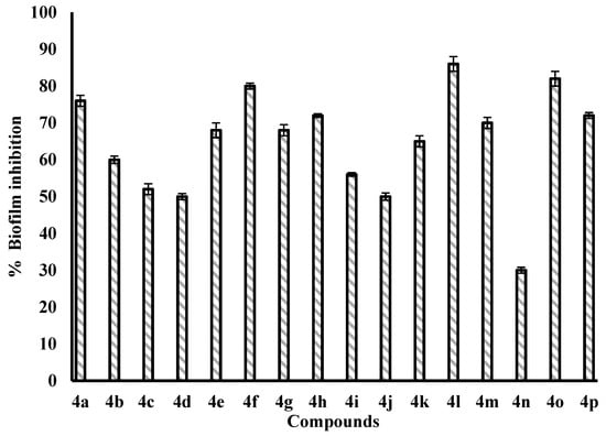The biofilm inhibition test was performed against the P. aeruginosa PAO1 bacterial strain using a crystal violet stain []. The assay results revealed significant biofilm inhibition by some of the compounds at 100 µg/mL. 4l, followed by 4o, 4f, 4a and 4h with 86%, 82%, 80%, 76% and 72% inhibition, respectively, were the most potent antagonists of biofilm formation (Figure 3). Importantly, 4f, 4g, 4h, and 4i with the 6-bromo-substituted coumarin ring displayed superior biofilm inhibition activity compared to their precursors 4a, 4b, 4c and 4d with the exception of 4j, which showed 50% inhibition in comparison to 4e (68%). These results suggest that bromo substitution is tolerated and enhances biofilm inhibitory activity. 4c, 4d, 4i, 4k, 4m and 4p showed biofilm inhibitory properties in the range of 50–72%, while 4n (log P = 5.26) with 30% inhibition was not effective in biofilm dispersal, which may be due to reduced cell permeability or steric hindrance caused by bulkier halogen atoms.