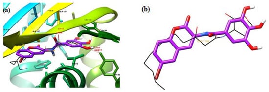 The nature of substituents present on the amido phenyl ring significantly influenced the biofilm activity. Compounds containing hydroxyl and amino groups (4a, 4f, 4l, 4m and 4o) showed greater biofilm inhibition, whereas substitution of chloro and nitro groups (4b, 4d, 4g, 4i and 4j) led to a decrease in biofilm inhibition. Compounds 4k and 4p with Ar-CH3 and proline groups displayed moderate activity with 65% and 72% inhibition. 4l bearing o-OH at the phenyl ring and bromo group at the C-6 position of the coumarin nucleus displayed the highest antibiofilm activity (86%) amongst all the synthesized coumarins. Overall, the synthesized compounds exhibited moderate to excellent levels of biofilm inhibition against P. aeruginosa. Some compounds were found to be superior in inhibiting the formation of biofilm than recently reported antibiofilm agents. At 100 µg/mL, seven compounds of the series exhibited more than 70% inhibition. These compounds also exhibited good affinity with the binding pocket of LasR protein with binding energy values less than −11 kcal/mole, which suggests that the biofilm inhibitory activity of these amidocoumarins might be due to the disruption in QS signaling.