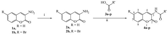 The synthetic route for the preparation of coumarin compounds is depicted in Scheme 1. 3-Nitrocoumarin 1a and 6-bromo-3-nitrocoumarin 1b were prepared via L-proline catalyzed condensation of ethyl nitroacetate and salicylaldehyde as reported earlier []. Nitrocoumarins 1a and 1b were reduced to 3-aminocoumarin 2a and 3-amino-6-bromocoumarin 2b, respectively, using acidified SnCl2. 3-Amidocoumarins 4a–p were prepared by reaction of 2a and 2b with suitable carboxylic acids 3a–p using PCl3 in acetonitrile under reflux for 5 to 6 h by slight modification in earlier reported method []. The structures of all the synthesized compounds were established on the basis of IR, 1H and 13C NMR and mass spectral data. Spectral data of compound 4a are shown in Figures S3–S6. The log P values were calculated using the ChemDraw 16.0 program (Table 1).