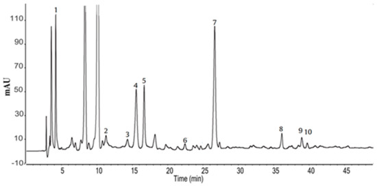 HPLC-DAD chromatogram of Bousrdoun date fruit variety. Peak numbers: (1) gallic acid; (2) chlorogenic acid; (3) vanillic acid; (4) caffeic acid; (5) syringic acid; (6) p-coumaric acid; (7) ferulic acid; (8) rutin; (9) luteolin; (10) quercetin.