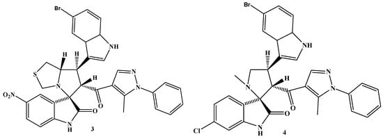 The structure of compounds 3 & 4: spirooxindole analogues engrafted with Indole and Pyrazole scaffolds.