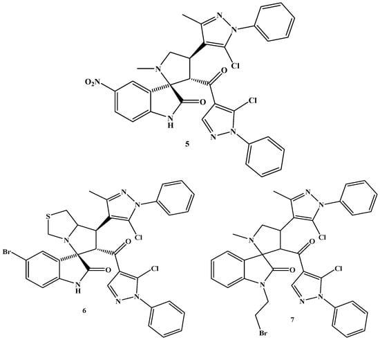The structures of compounds 5, 6, & 7: spirooxindole analogs tethered to the pyrazole scaffold.