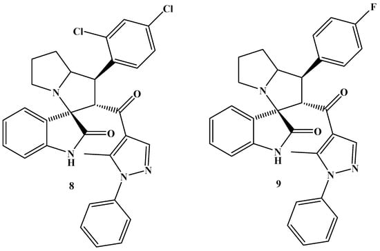 The structure of compounds 8 & 9: spirooxindole analogs engrafted with pyrazole scaffolds.