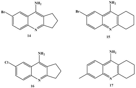 Lukas Gorecki et al., 2021 [44] reported a series of 30 novel tacrine derivatives outlined for the evaluation of structure–activity relationships and studied the receptors using electrophysiology with HEK293 cells expressing the defined types of NMDARs. Compounds 14 and 15, which were selected, effectively inhibited both GluN1/GluN2A and GluN1/GluN2B receptors. The GluN1/GluN2B receptors were more effectively inhibited by compounds 16 and 17. The structure of potent AChE inhibitors are shown in Figure 5. At a concentration of 100 μM, GluN1/Glu2B were inhibited at −60 mV, expressed as the IC50 value, and there was relative inhibition of GluN1/Glu2A at +40 mV based on a QSAR study. The statistically significant model revealed by the QSAR study can be employed for a ligand-based virtual screening and to determine the potent molecule for inhibition of GluN1/Glu2A and/or GluN1/Glu2B subtypes. The tested compounds did not cause hyperlocomotion in an open field and also did not impair the prepulse inhibition of the startle response compared to MK-801 when in vivo experiments were carried out in rats but did show minimal induction of psychotomimetic side effects. Overall, it is confirmed that tacrine derivatives are encouraging as they are centrally available subtype-specific inhibitors of NMDARs without any complications.