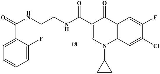 The structure of compound 18: 7-chloro-1-cyclopropyl-6-fluoro-N-(2-(2- fluorobenzamido)ethyl)-4-oxo-1,4-dihydroquinoline-3-carboxamide.