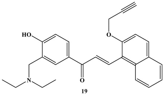 Ghadah Aljohanie et al., 2021 [46], who used the Claisen–Schmidt condensation reaction, synthesized 12 novel chalcones by treating 2-alkyloxy-naphthaldehydes and mannich bases of 4-hydroxyacetophenone with a catalytic amount of SOCl2 in ethanol to obtain the chalcones with good yield. Structural confirmation was performed using spectroscopic analysis using FTIR, 1D and 2D NMR, and HRMS spectroscopy. Molecular docking was carried out to study the ligand interactions with the target to highlight its affinity. In addition to the docking functions, the computational biology study highlighted the structure–activity relationship (SAR) and pharmacokinetic properties (absorption, distribution, metabolism, excretion, and toxicity or ADMET) of the potential ligands. To screen their affinity towards the AChE enzyme (PDB 1EVE), comparative docking analysis was carried out. The synthesized chalcones exhibited lower binding energy (−13.06 to −10.43 kcal/mol) against AChE compared to donepezil (−10.52 kcal/mol). The study on SAR explored the introduction of diethyl amine in ring A of the structure of the chalcone skeleton, and the propargyl moiety of ring B is known to be a potential drug against AD. The complex nature of chalcone 19 shown in Figure 7 was proven to be advantageous, indicating an effective and promising drug against AChE.
