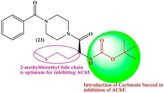 A series of novel sunifiram–carbamate and sunifiram–anthranilamide hybrids were designed and synthesized by Khalid A. Agha et al., 2022 [48] and evaluated for cholinergic activity. The authors concluded that introducing carbamate to the skeleton of synthesized targets resulted in good AChE inhibitory activity. Novel sunifiram analogs that are able to modulate N-methyl-D-aspartate Receptors (NMDARs) and are equipped with the structural features that enable them to inhibit acetylcholinesterase enzyme were constructed. A carbamate moiety as well as 2- or 4-aminophenyl and 3-pyridyl moieties aided the AChEI activity of the targets. The most potent AChE inhibitory activity with an IC50 value of 18 ± 0.2 nM was exhibited by the target compound: the sunifiram–carbamate hybrid 23. Such ability of compound 23 (Figure 8) along with its favorable log p value (2.36), its ability to induce ACh release from A549 cells, and its in vivo ability to lower AChE activity in the rat brain makes it worthy of further investigation as a promising nootropic agent. Compared to sunifiram (−4.5 kcal/mol) and the anthranilamide hybrid (−4.5 kcal/mol), it exhibited a molecular docking score −1.7 kcal/mol when docked to the glycine-binding pocket of the NMDA receptor.