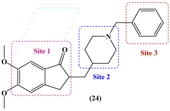 Makar Makarian et al., 2022 [49] planned and synthesized a series of 12 donepezil-based analogs with moderate yield by adopting an environmentally friendly route, i.e., by employing microwave irradiation, and the structural purity of the synthesized compounds was confirmed by spectral analysis. With donepezil as a standard, the synthesized compounds were tested against electric eel AChE enzyme using Ellman’s spectrophotometric method for their inhibitory activity. The SAR study of compound 24 as mentioned in Figure 9 showed that through aromatic π- π stacking interactions, an indanone moiety (Site 1) bound to the peripheral anionic site (PAS) of enzyme AChE, and the piperidine ring (Site 2) exhibited an interaction with the anionic part of the catalytic active site, i.e., with the amino acid tyrosine (Y337). The benzyl moiety of donepezil (Site 3) was in close proximity to tryptophan (W86), and two amino acids, H447 and S203, were both part of the catalytic triad. It was clear from the SAR study that alteration at site 3 could lead to the development of potent AChE inhibition, that is, the replacement of the benzyl moiety at site 3 with the pyridine ring could be a potent inhibitor of electric eel AChE.