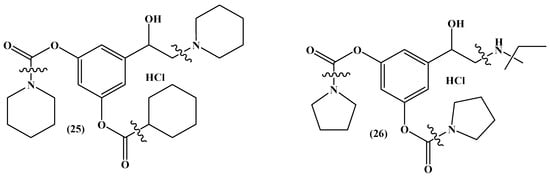 Ana Matosevic et al., 2022 [50] designed and synthesized 18 biscarbamate compounds with various substituents in the carbamoyl and hydroxyaminoethyl chain, and their inhibitory potential and inhibition selectivity were determined toward both cholinesterases. Confirmation of the structure of the compounds was performed through NMR and HRMS spectra. For all of the synthesized compounds, the potential of biscarbamates to reduce the activity of human BChE and AChE was examined. The synthesized compounds inhibited BChE, which proves these compounds are fast or very fast BChE inhibitors with ki constants in the range of (0.0144–38.0)106 M−1 min−1. The molecule with piperidine in the carbamoyl and hydroxyaminoethyl chain was confirmed to be compound 25, which exhibited the fastest inhibition, being an almost 10 times faster inhibitor than bambuterol. But the compounds 25 and 26 as depicted in Figure 10 that inhibited BChE 1288 and 1087 times faster than AChE were the most selective. Ultimately, the study revealed that on the benzene ring, biscarbamates with a meta disposition of carbamate groups could be a favorable core base for the design of new AD drugs. Compared to the standard drug rivastigmine, compound 26 actively inhibited BChE and is supposed to be non-toxic and be able to pass the BBB and have the capacity to chelate biometals. Finally, a study singled out compounds 25 and 26 as the most promising for the treatment of AD.