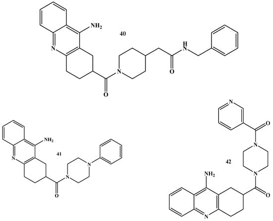 Bhushanarao Dogga et al., 2022 [57] designed, synthesized, and evaluated a series of 11 analogs of tacrine-2-amide for anti-AD. Out of 11 analogs, compounds 40, 41, and 42 (Figure 16) showed good activity at concentrations of 23.66 nM, 20 nM, and 24.33 nM, respectively, whereas, the other eight derivatives showed moderate activity at less than 100 nM. In silico study revealed that these 11 analogs can strongly bind to both the CAS and PAS of an enzyme. Docking studies clearly revealed that compound 40 showed good affinity toward AChE with a binding energy of 24.03 kcal/mol and had a glide score of 10.38 kcal/mol. Also, compound 40 exhibited π-π stacking with Trp86 and showed an interaction with Tyr341. Similarly, compound 41 had a glide score of −11.22 kcal/mol and a binding energy of −30.88 kcal/mol, which was contributed by pi–pi stacking interaction with Trp86 and a hydrogen bond with the amino group of tacrine with His447.