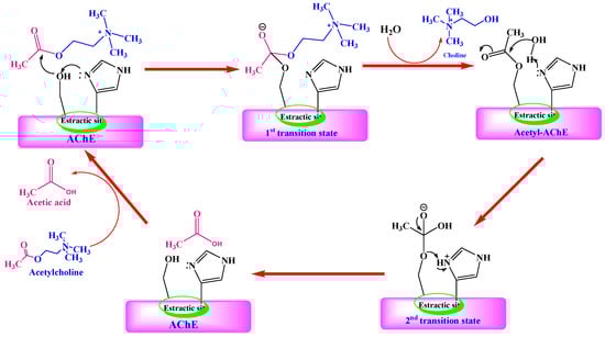 The enzyme acetylcholinesterase is a serine hydrolase that belongs to the esterase family within the higher eukaryotes as shown in Scheme 2. This enzyme acts on different types of carboxylic esters. In the cholinergic synapses of the central nervous system (CNS), AChE hydrolytically cleaves the acetylcholine molecule into choline and acetic acid, thereby terminating the impulse transmissions. The interaction between AChE and β-amyloid accelerates the formation of β-amyloid aggregates through the PAS (peripheral anionic site). This finding reveals that an ideal AChE inhibitor should be able to interact with both the CAS (catalytic active site) and PAS of the AChE enzyme [27]. Although the exact reason for AD is clearly not known, the cholinergic hypothesis proposes a direct correlation between the acetylcholine level in the brain, which is hydrolyzed by the enzymes butyrylcholinesterase and AChE, and the disorder. Acetylcholinesterase, compared to butyrylcholinesterase, plays an important role in the breakdown of acetylcholine into choline and acetic acid, leading to the termination of neurotransmission signals [28,29] (Scheme 2).
