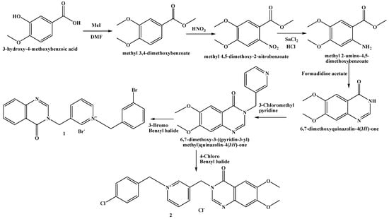 Samaneh Zarei et al., 2021 [38] designed and synthesized the novel series of 1-benzyl-4-((4-oxoquinazolin-3(4H)-yl) methyl)-1-pyridinium derivatives as shown in Scheme 4 by treatment with 3-hydroxy-4-methoxy benzoic acid and iodomethane in DMF, which yielded methyl 3,4-dimethoxy benzoate. Nitration, subsequent reduction, and cyclisation of the above compound yielded 6,7-dimethoxyquina-zolin-4(3H)-one. In the presence of K2CO3 and by adding appropriate benzyl halide derivatives, final compounds were gained by treating the above compound with 3- or 4-(chloromethyl) pyridine in DMF. Ellman’s method was employed for the evaluation of AChE and BuChE inhibitory activities. Using Autodock 4, a docking study was carried out to explore the binding mode of the most active complexes 1 and 2 in the active position of BuChE (PDB: 6QAA) and AChE (PDB: 1EVE). The compound 1-(3-bromobenzyl)-3-((4-oxoquinazolin-3(4H)-yl)methyl)pyridin-1-ium bromide (1) was found to be the most active among all synthesized compounds exhibiting dual inhibition activity for AChE (IC50 = 5.90 ± 0.07 μM) and BuChE (IC50 = 6.76 ± 0.04 μM). Further, the compound 1-(4-chlorobenzyl)-3-((6,7-dimethoxy-4-oxo quinazolin-3(4H)-yl)methyl)pyridin-1-ium chloride also showed potent AChE inhibitory activity (IC50 = 1.11 ± 0.09 μM) (2). The pharmacokinetic properties of 1 and 2 were studied along with it by employing the Lipinski rules of five.