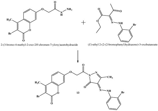 Siju Ellickal Narayanan et al., 2021 [43] aimed at designing and synthesizing various brominated derivatives of 7-hydroxy-4-methyl coumarin as a new scaffold (Scheme 5), which were evaluated for their anti-Alzheimer’s property by in vivo and in vitro models. The 7-hydroxy 4-methyl coumarin derivatives were synthesized and brominated with a group of three novel pyrazoles. Based on the docking score of the designed compounds, a single entity (13) was selected for the treatment of Alzheimer’s disease. Three new pyrazoles furnished with brominated 7-hydroxy-4-methyl-coumarin derivatives were designed by Argus lab 4.0.1 version, and the molecular docking studies revealed that compound 13 was able to bind simultaneously to the amino acid and to the acetylcholine esterase enzyme active sites. The structure of compound 13 was confirmed by spectral analysis, and by adopting in vivo and in vitro methods, the anti-Alzheimer’s activity was evaluated; the obtained results were compared statistically by one-way ANOVA by using GraphPad Prism. The compound resulted in a significant increase in the acetylcholine esterase level in acetylcholine esterase inhibition assay. The compound exhibited a promising antioxidant property based on the DPPH (2,2-diphenyl-1-picryl-hydrazylhydrate) method. Compared to the standard donepezil, the group pretreated with compound 13 exhibited a marked increase in memory and learning in and elevated plus maze model. Based on its promising antioxidant property and acetylcholine esterase inhibitory activity and MAO inhibitory activity, compound 13 can be marked as a new series among the designed pyrazoles furnished with brominated 7-hydroxyl-4-methyl coumarin derivatives.