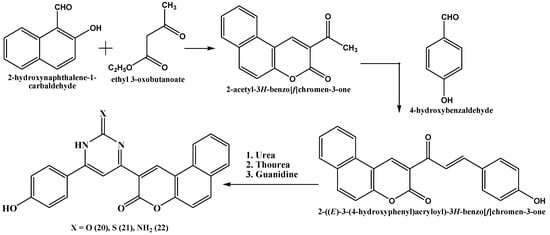 In a study conducted by Zaizafoon Nabeel et al., 2022 [47], novel benzo[f]coumarin derivatives with a pyrimidine unit were synthesized successfully as represented in Scheme 6. In the alkaline medium, the benzo[f]coumarin chalcone was prepared by condensing 3-acetyl-5,6-benzocoumarin and 4-hydroxybenzaldehyde Via Claisen–Schmidt condensation. By the cycloaddition of chalcone with urea, thiourea, and guanidine HCl and in the presence of glacial acetic acid, various pyrimidines were synthesized. Through spectral and elemental analyses, the structures of the newly synthesized compounds were characterized. To assess the potential of the synthesized compounds as AChE inhibitors, an in silico study was carried out using molecular docking simulation. Discovery Studio Visualizer was employed to determine the foremost binding mode with the receptor and obtain 3D interaction poses. The docking simulations of the compounds exhibited greater electrostatic interactions (van der Waals, π-π stacking, and H bonds) with lower docking energies (−17.4, 13.6, and −11.3 kcal/mol) compared to the docking score of the standard donepezil (−10.6 kcal/mol). Compound 3 demonstrated four H-bond interactions with key amino acid residues, including Ser235, Asn230, Pro232, and His398. Other electrostatic interactions were observed between derivatives 20 and 21 and residues Cys402, Trp524, and Ala234, indicating similar binding interactions with the active pockets of the AChE enzyme. Furthermore, the compounds were screened for their AChE inhibitory activity using Ellman’s method, with donepezil as the standard. The Ellman’s assay results disclosed that derivatives 21 and 22 had AChE inhibitory activity and revealed higher inhibition percentages at the concentrations of 10–4 and 10–10 M while a lower inhibition percentage was obtained at 10–12.
